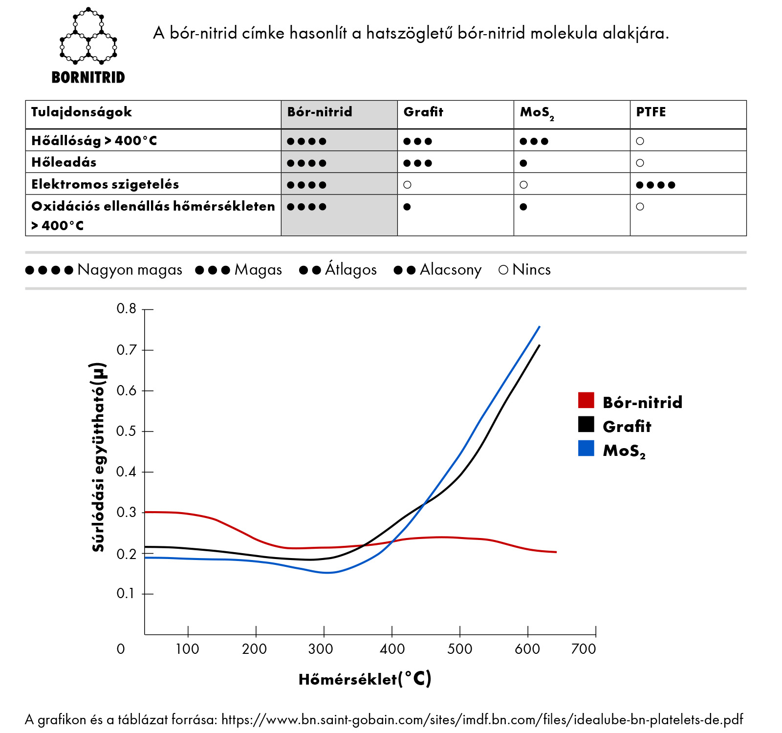 Az általunk forgalmazott termékek esetében a kenőanyagok legújabb generációjában már a bór-nitridet alkalmazzuk, ami egy természetes nyersanyag, úgy is ismert, mint “szervetlen” vagy “fehér grafit”. A bór-nitrid hexagonális módosulata (h-bornitrid) hasonlít a grafithoz, így kenőanyagként használjuk. A grafittal ellentétben a hexagonális bór-nitrid súrlódási együtthatója stabil marad 1000 °C fölött is, ezért nagyon jól alkalmazható magas hőmérsékletű szilárd kenőanyagként vákuumban. Magas hőmérsékleten (1400-1800 °C) és magas nyomáson (> 6GPa) a hexagonális módosítás átalakul köbös módosulattá, hasonlóan a grafit gyémánttá történő átalakulásához. Mindkét bór-nitrid típus fehér színű, alacsony és mérsékelt hőmérsékleten nem vezetik az elektromosságot.