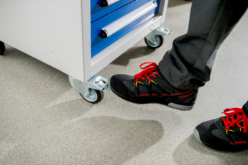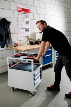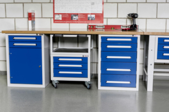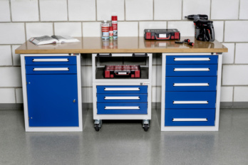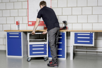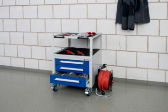 Masszív és könnyen irányítható kerekes kocsi tárolótálcákkal és fiókokkal.